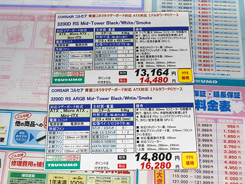 ツクモパソコン本店では3200D RS ARGBのスモークが、TSUKUMO eX.では3200D RS ARGBのホワイトが展示されている。