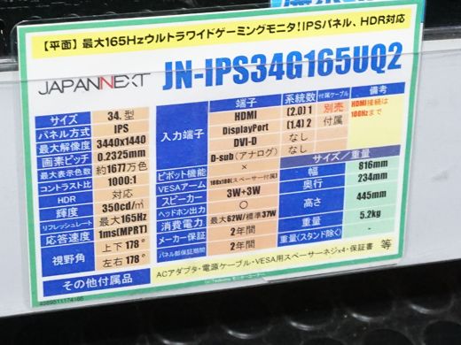 ウルトラワイドIPSパネル採用の34インチゲーミングモニター「JN-IPS34G165UQ2」がJAPANNEXTから登場。店頭価格は47,980円。TSUKUMO eX.では実機展示が行われている。