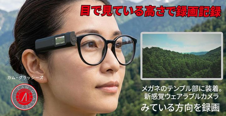 カム・グラッシーズは録画解像度が1080P、720P(各30fps)のカメラで、メガネのテンプル部に装着し目線の高さで録画できるというもの。見ている方向をそのまま録画し、従来の胸・頭部装着カメラとは異なる、より自然な視点での撮影が可能としている。