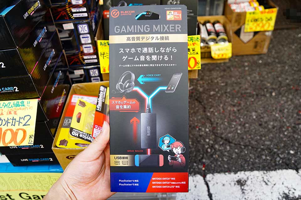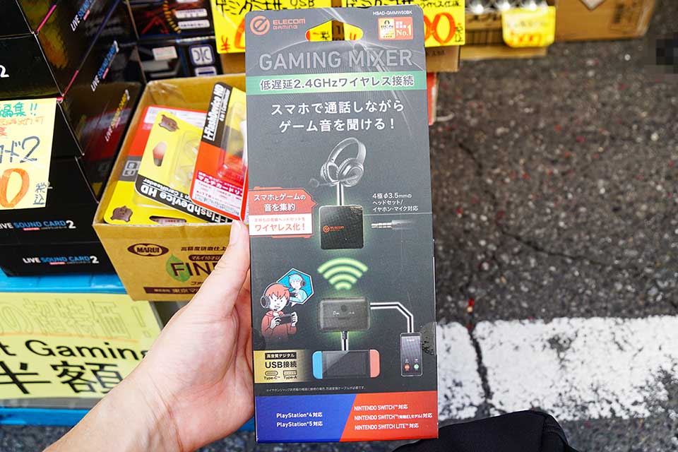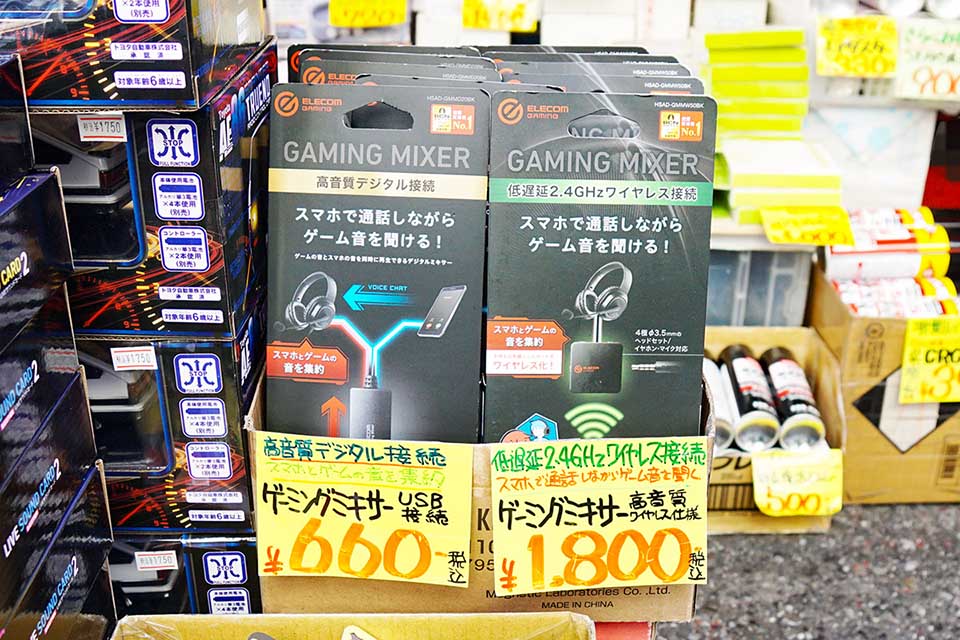 あきばお~八號店で、ELECOMのゲーミングミキサーが特価販売。スマートフォンなどのボイスチャットの音声とゲーム機の音声の両方を同時にイヤホン/ヘッドホンへ流したい時に便利なアイテム。USB接続モデルの「HSAD-GMMD20BK」660円と、ワイヤレス仕様の「HSAD-GMMW50BK」1,800円が販売されていました。