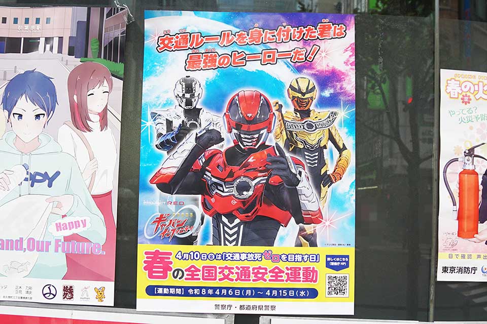 朝風二号館ビルに、春の全国交通安全運動の一環として「超宇宙刑事ギャバン インフィニティ」の交通安全ポスターが掲載されていました。
