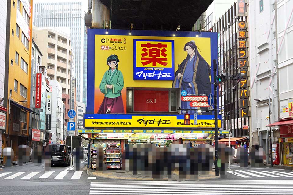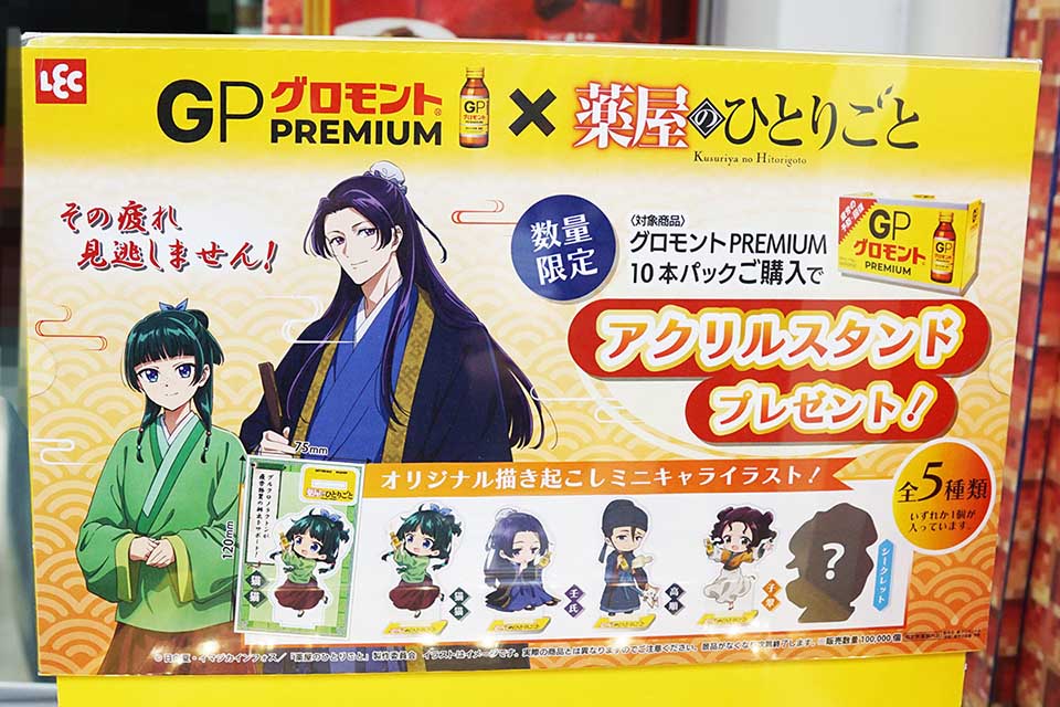 マツモトキヨシ アキバ店は、「グロモントPREMIUM × TVアニメ「薬屋のひとりごと」コラボキャンペーンを開催。店頭看板が「薬屋のひとりごと」仕様になっていました。薬屋つながりで、ある意味親和性の高いコラボレーションと言えるのでしょうか。