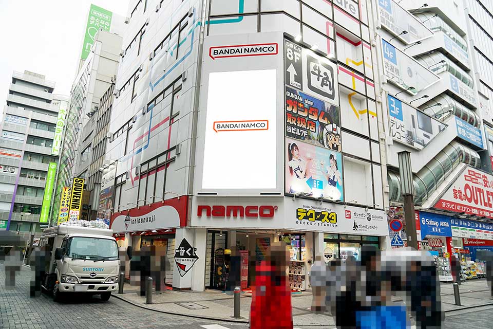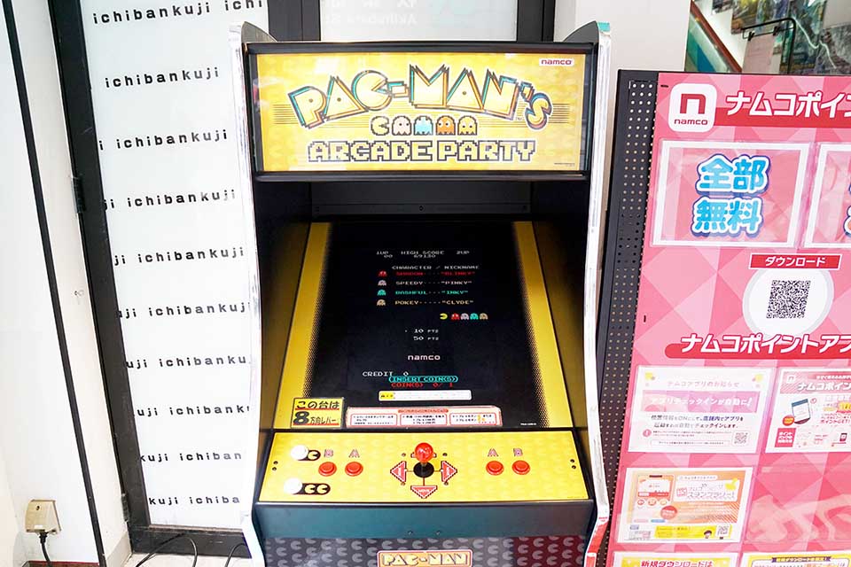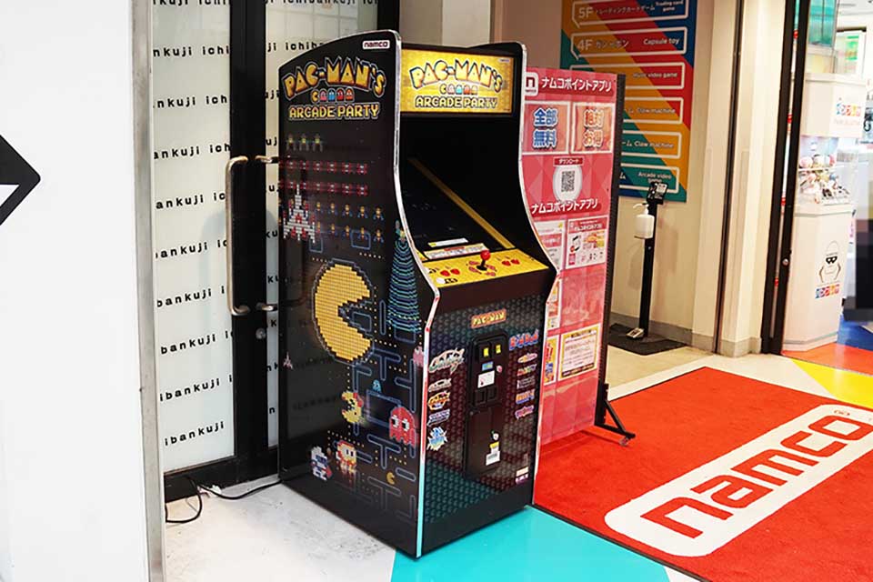 namco秋葉原店の店頭に「PAC-MAN'S ARCADE PARTY」の筐体が設置