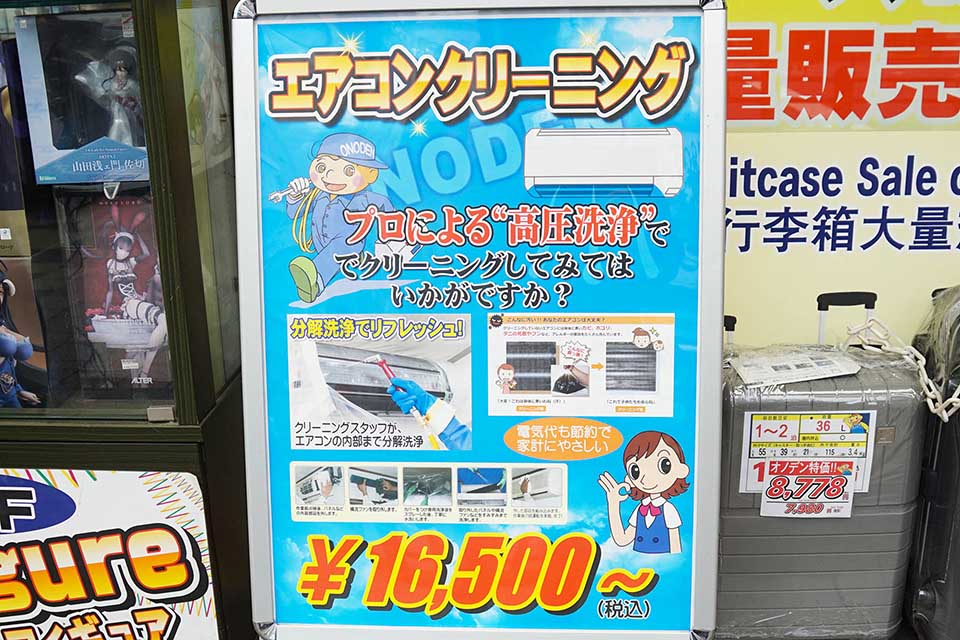 オノデンの店頭で、エアコンクリーニングのアピールが行われてていました。自分で行うには大変な作業になるので、本格的な暑さが来る前にプロの手で清掃してもらうのもよいいかもしれませんね。