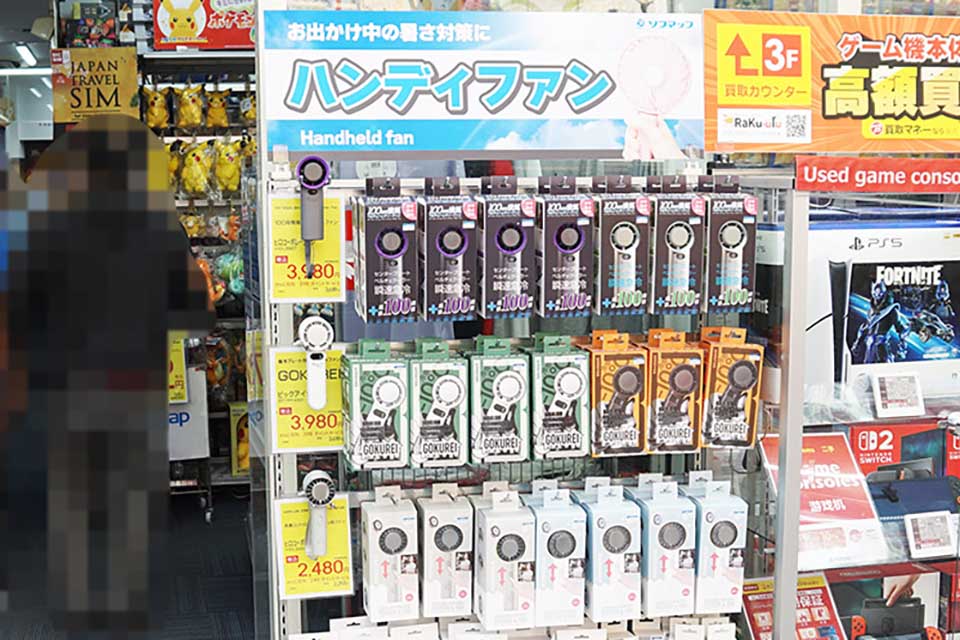 ソフマップ AKIBA アミューズメント館は、ハンディファンなど暑さ対策グッズの店頭販売を開始。取材日は4月中旬にもかかわらず27度を越える暑さで、早くも暑さ対策アイテムが店頭に並びだす事態となっていました。