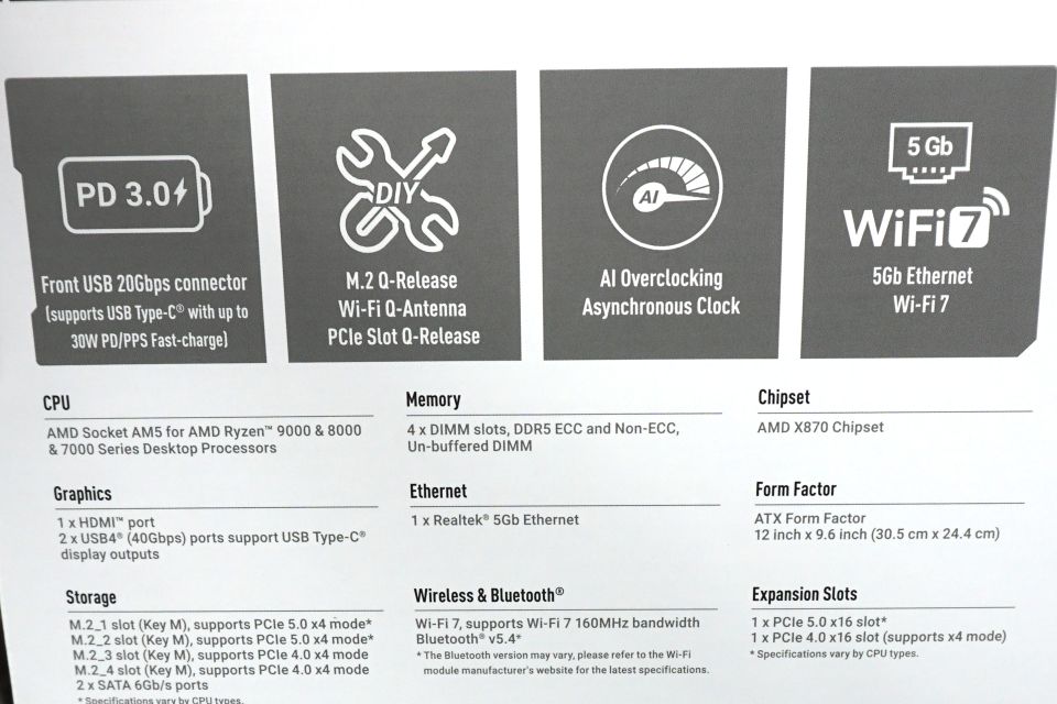 メモリスロットはDDR5-DIMM×4で、最大DDR5-9600+に対応。拡張スロットはPCIe 5.0 x16×1、PCIe 4.0 x16×1。M.2スロットは4ポート。