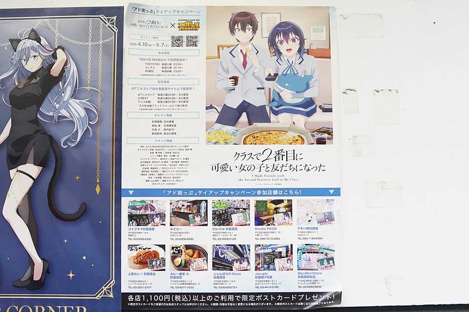 秋葉原の10店舗を対象にした「クラスで2番目に可愛い女の子と友だちになった × アド街っぷ」タイアップキャンペーンが開催。対象店舗で1,100円以上の買い物をすると限定ポストカードが貰えます。開催期間は5月7日(木)まで。