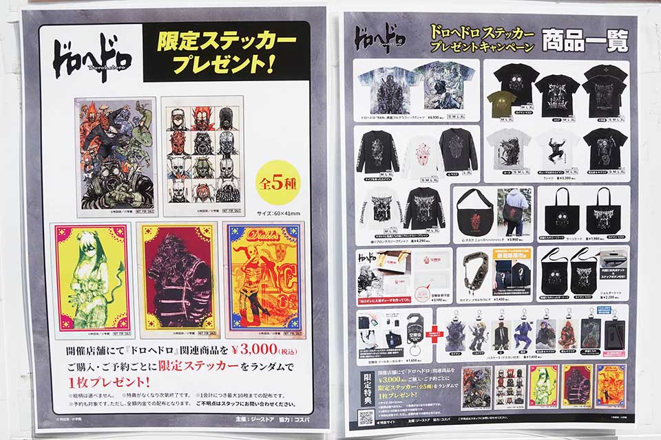 オノデン1階のグランエンタスでは、「ドロヘドロ限定ステッカープレゼントキャンペーン」が開催。特設コーナーで、3,000円以上グッズを購入すると「限定ステッカー(全5種)」がランダムで1枚もらえます。