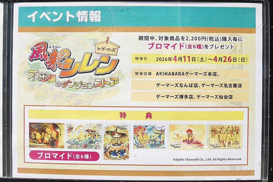 AKIHABARAゲーマーズ本店6階では、「超次元ゲイムネプテューヌ 15周年記念ねぷねぷミュージアム」(4月29日(水)まで)が開催。5階では、「ネコぱら ラブプロジェクト」ポップアップストア(5月10日(日)まで)が開催。1階では、「風来のシレン 不思議のダンジョンストア」(4月26日(日)まで)が開催されていました。