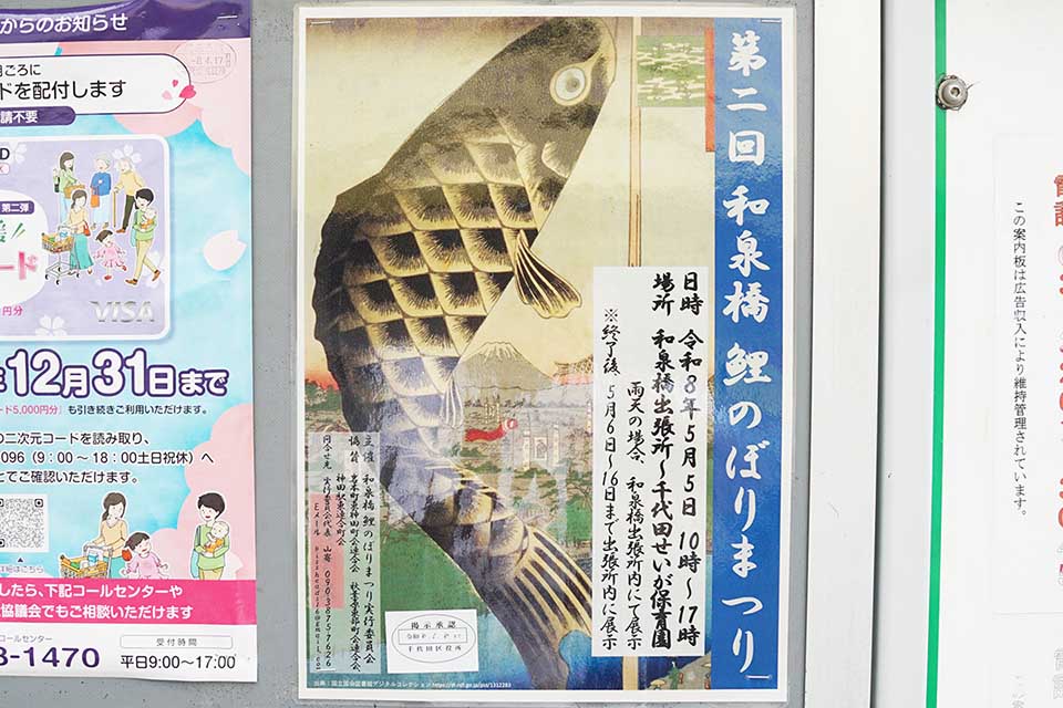 千代田区からのお知らせに、「第二回 和泉橋 鯉のぼりまつり」の開催告知が掲載されていました。5月5日(火)に、和泉橋出張所~千代田せいが保育園までの区間に鯉のぼりの川渡しが行われるとのことです。