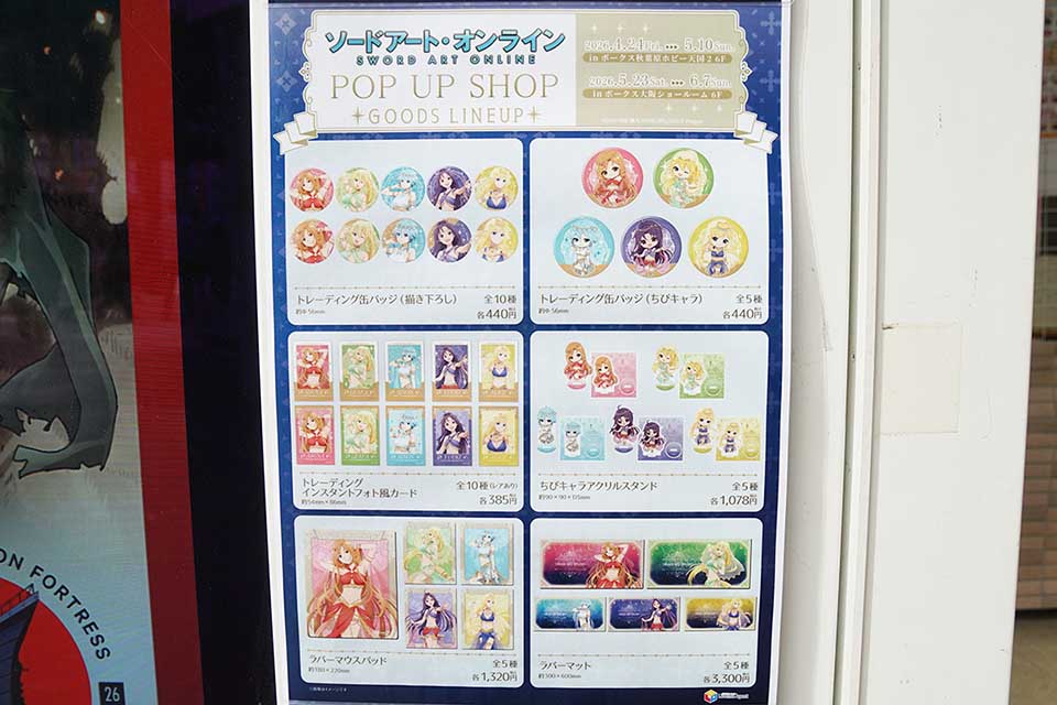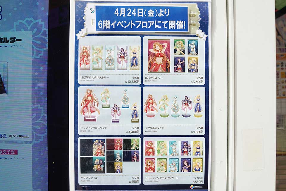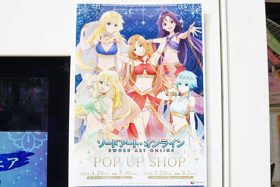 ボークス秋葉原ホビー天国2では、6階で開催予定の「ソードアート・オンライン」ポップアップショップの告知が掲載されていました。登場キャラクターが踊り子衣装を纏った、新規描き下ろしグッズの販売を実施予定との事です。開催期間は4月24日(金)~5月10日(日)まで。