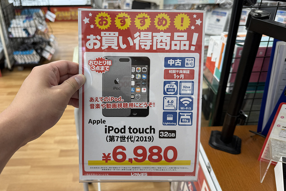 Appleのポータブルメディアプレイヤー「iPod touch(第7世代/2019年モデル)」の中古品が、じゃんぱら秋葉原5号店で特価販売中。価格は6,980円で、保証期間は1か月となっています。
