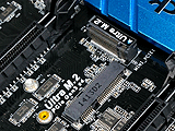 データ転送速度を高めた「Ultra M.2」スロットもユニーク。通常のM.2スロットでは、チップセットのPCIe Gen2 x2インターフェイスにより転送速度10Gbpsがサポートされているが、Ultra M.2ではCPU内蔵のPCIe Gen3 x4を用いることで、より高速の32Gbpsがサポートされている。