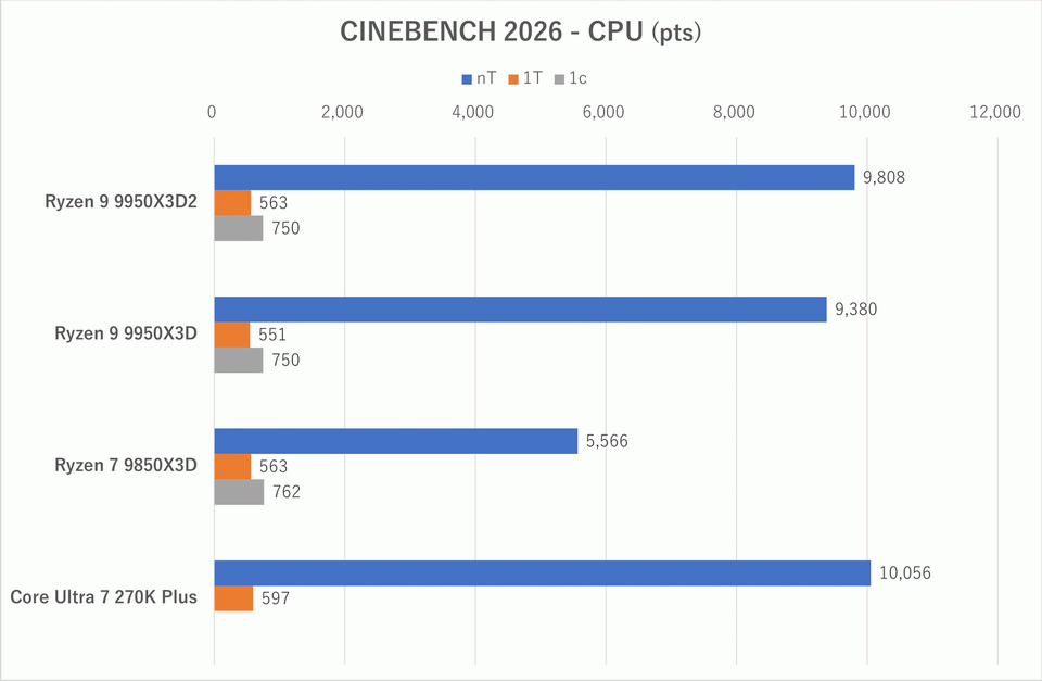 では検証を始めよう。「Cinebench 2026」におけるマルチスレッド(nT)、シングルスレッド(1T)性能を比較する。Cinebench 2026で追加された特定の1コアにだけ負荷をかけるSMTテスト(1c)については、Ryzen環境のみ実施した(Core Ultra 7 270K PlusはSMT非対応であるため実施不可である)。