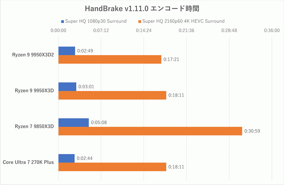 ここでもRyzen 9 9950X3D2は最短時間で処理を終了しているが、2番手の9950X3DやCore Ultra 7 270K Plusと比較して劇的に高速というわけではない。Ryzen 7 9850X3Dはゲームでは確かに強いが、このテストのようなCPUパワーでエンコードするような作業は弱い。それを補うために通常のZen 5 CCDを追加したのがRyzen 9 9950X3Dであるが、それに3D V-Cacheを増量したRyzen 9 9950X3D2は価格のわりにリターンが弱い印象を受ける。