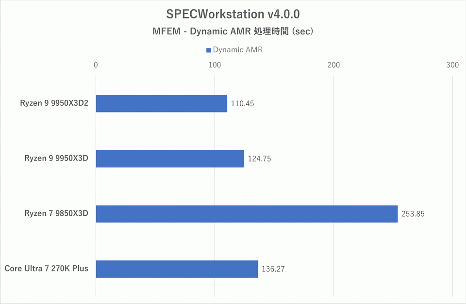 上のグラフは有限要素法ライブラリMFEMを用い、Dynamic AMR(メッシュ密度を動的に変更しながら偏微分方程式を解くワークロード)を実行した際の処理時間比較である。すべてのテストにおいて、スレッド数=物理コア数としている。これはSPECWorkstation側の設定だが、メモリアクセス競合を減らし計算効率を上げるための設定と考えることができる。