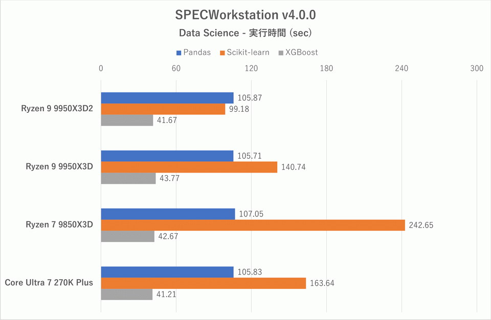 ここで注目したいのはPandasやXGBoostではCPU間の差がほとんどないのに対し、Scikit-learnでは強烈な差が出ている点だ。コア数が効いているのはRyzen 7 9850X3DとRyzen 9 9950X3Dの結果からほぼ明らかだが、Ryzen 9 9950X3Dに比して9950X3D2はさらに処理時間を短縮できている点から、3次キャッシュの搭載量や対称性が強く影響していることが分かる。