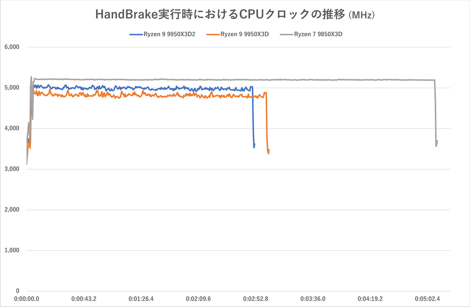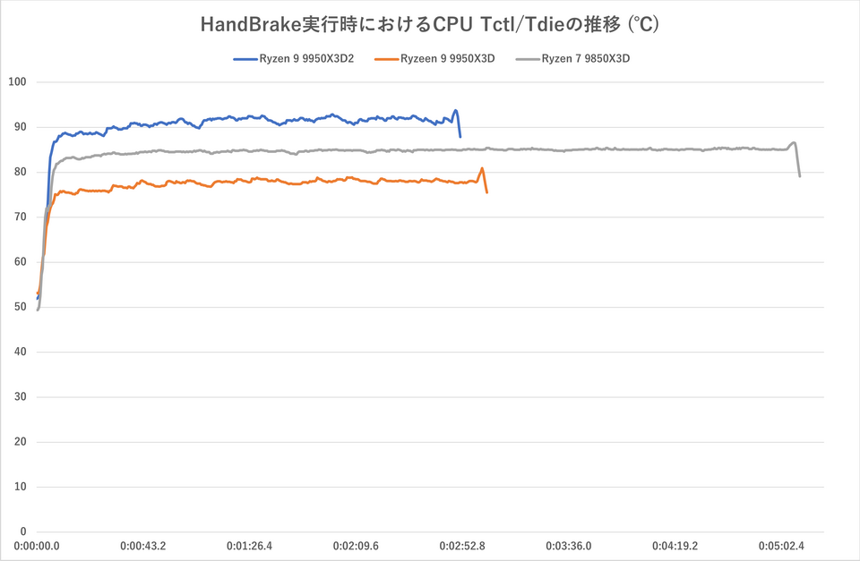 最後にRyzen 9 9950X3D2の発熱やクロックの推移などのデータを見ておこう。前掲のHandBrakeによるエンコードテスト(Super HQ 1080p30 Surround)時におけるCPUクロックやCPU温度(Tctl/ Tdie)などを「HWiNFO Pro」を用いて追跡した。Core Ultra 7 270K Plusは得られる情報が異なるため、ここでは除外している。