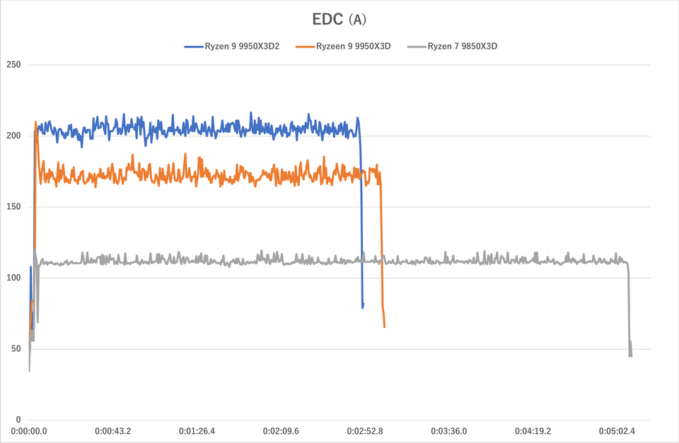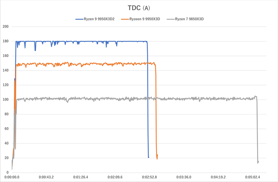 CPU Package Power/EDC/TDCもチェックしてみよう。どのパラメーターに関してもRyzen 9 9950X3D2の値が最も高く、Ryzen 7 9850X3Dが安定して低い。注目したいのはTDCで、Ryzen 9 9950X3D2はほぼ定格(180A)一杯のまま推移している。つまり熱設計上の電流制限一杯を使って動作した上で、あの温度(最大93℃)になっているのだ。