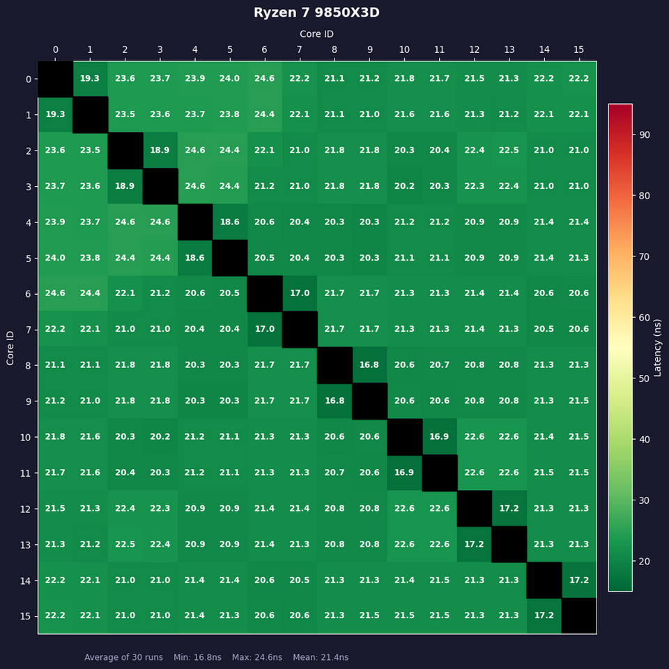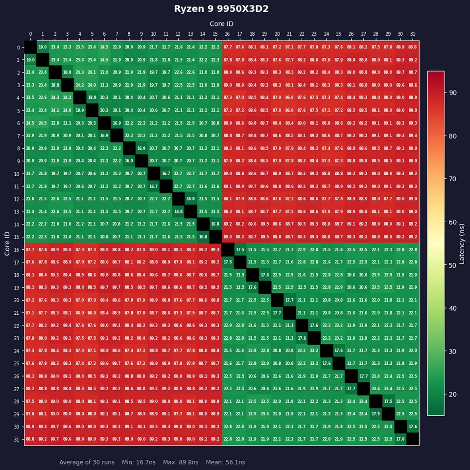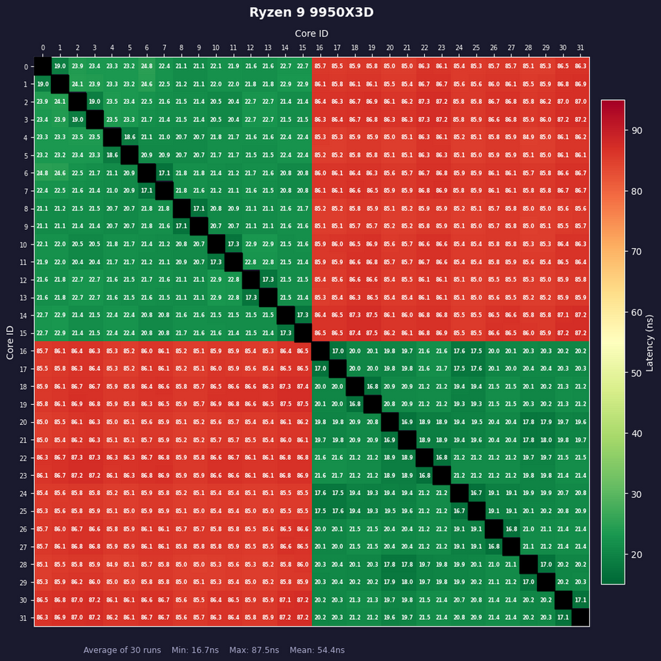 3D V-Cacheを2基追加したことで、コア間レイテンシーは変わったのだろうか? ここでは「core-to-core-latency-plus」を用いコア間レイテンシーを計測、その結果からヒートマップを作成した。コアのペアにつき5,000回計測、それを全ペアについて300回サンプルした平均をとる作業を1セットとし、30セット繰り返した後に平均値を算出したのが以下の図である。緑が濃くなるほど低レイテンシー、赤が濃くなるほど高レイテンシーである。