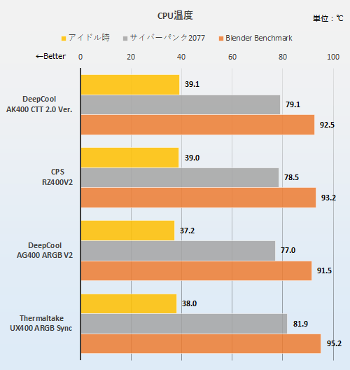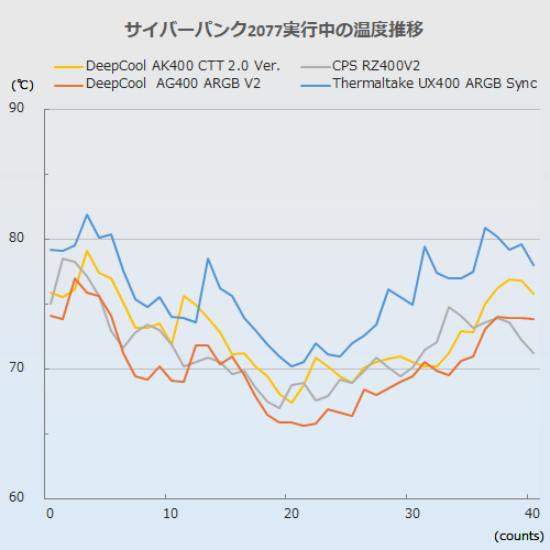 おおむね70℃台で推移しており、多少のタイミングずれはあるとしてAK400 CTT 2.0 Ver.とAG400 ARGB V2、RZ400V2は近しいライン。UX400 ARGB Syncはやや上を推移しているが、サイバーパンク2077のCPU負荷だと81.9℃なので高過ぎるほどではない。ただしPWM制御的にはやや回転域高めのゾーンに入ってしまうので、本来静音がウリなのにほかよりうるさいという逆転現象が生じている。たとえば統合GPUを利用してゲームを楽しむといった場合なら「ファン回転数の低いゾーンに収まる程度にもっと冷える製品」を選びたくなるかもしれない。