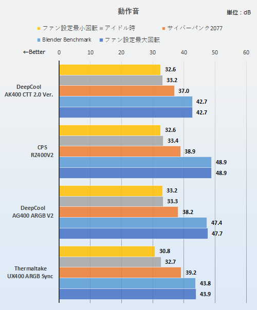 もっとも、ゲームプレイ中の動作音が40dB以下という計測結果はかなり静かなレベルで、実際にはビデオカードやケースファンの動作音のほうがうるさく感じることのほうが多い。それであれば、“必要十分に静かで冷えて、かつARGB対応なのに安価”というUX400 ARGB Syncの別のメリットを評価すべきところだろう。