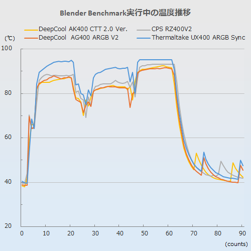 次は一定時間内のCPU温度の推移を比較してみる。こちらのグラフはBlender Benchmark 3.2.0実行中のもの。