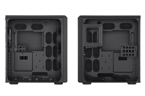 Air 5400を正面上方から見たとき、ケースの左半分はマザーボードの土台として各種パーツを収めるメインチャンバー、右側の前方1/4くらいのスペースはCPUクーラーのラジエーター&ファンの設置するチャンバー、右側後方3/4程度は電源ユニットとケーブル類の収納するチャンバー、となっている。各チャンバーの“仕切り”には“隙間”や“穴”があり、これを通して各チャンバー間でケーブルやチューブを通す。