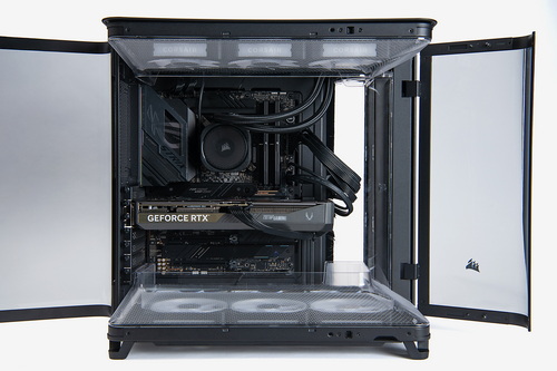 そこでCORSAIRが採用したのが、(1)マザーボードやビデオカードなどの主要パーツ、(2)電源ユニットやケーブル類と2.5/3.5インチストレージ、(3)CPUからの熱を冷やすための水冷CPUクーラーのラジエーター、の3グループを、それぞれ別のチャンバーに切り離して配置する“トリプルチャンバー”という構造だ。CPUとCPUクーラーがほぼ一体になる空冷方式に対し、最終的に熱を冷やすためのラジエーターとファンをCPUから離れた場所に置ける水冷方式だからこそ成立するものだ(そのため、Air 5400を空冷CPUクーラーで運用するのはコンセプトに合致しない)。