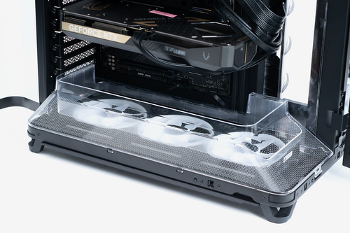 Air 5400の標準構成では、3基の12cm角ファンが底面に吸気方向でセットされており、トンネル状に「下から上」へのエアフローが作られる。取り込んだ外気をビデオカードのファンがさらに取り込み、排気を上方向に流して外に出す、というもの。底面側および天板側にはそれぞれ空気の流れを整えるエアダクト(クリアパーツ)が取り付けられており、ファンで取り込んだ外気を確実にマザーボード方向に流していく。