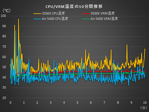 折れ線グラフの位置を見れば違いは明らかで、CPU、VRMともに終始Air 5400環境が3500X環境を下回った。10分間の平均値で見ると、CPUは約10.5℃、VRMは約2.3℃、Air 5400のほうが低かった。ケースの違いだけでこれだけの差が付くのを目にする機会はそうそうないだろう。また、ファンでアクティブに冷却していないVRMについてもわずかではあるがピラーレスケースよりも好結果になっており、メインチャンバーのエアフローのよさがうかがえる。