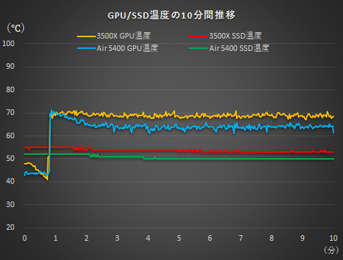 GPUは、最初の1分少々は似たような温度推移を見せたが、その後はAir 5400環境ではじりじりと温度が下がり、60℃台前半をキープした。一方の3500X環境では、序盤に70℃前後まで上がり、その後も大きく下がることはなく70℃弱で推移した。また、VRM同様にヒートシンクのみの熱対策だったSSDについても平均で約2.3℃ほどAir 5400が下回った。ラジエーターとビデオカードが同じチャンバー内に“同居していない”効果は、GPUの冷却にも存分に発揮されていると見てよいだろう。また、底面から天板方向へのエアフローがビデオカードに遮られているSSDについても、それなりに恩恵は受けられているようだ。