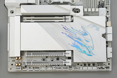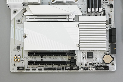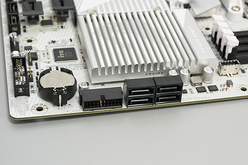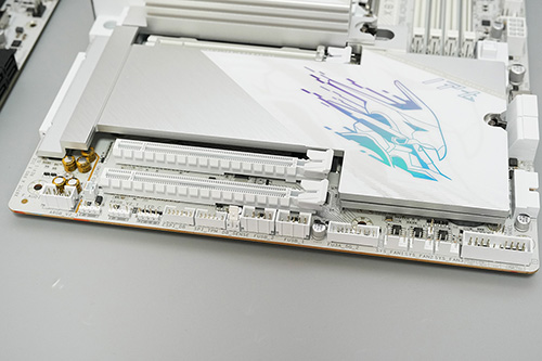 拡張スロットのパーツも真っ白なものが使われているとより美しくなります。USBヘッダピンやファンコネクタ、SATAコネクタなども白いパーツに。こうした細かい部分も白で統一されると、マザーボード全体の印象が変わってきます。
