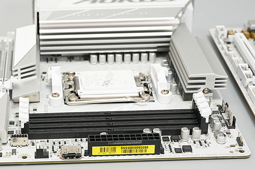 メモリスロットが真っ白になるとだいぶ印象が変わります。24ピン電源コネクタやCPU用8ピンコネクタも白いパーツが使われており、全体的にスッキリとした見た目に。メモリや電源ケーブルのコネクタが白ければある程度隠したりもできる部分ですが、白いパーツが使われているとやはり美しいです。