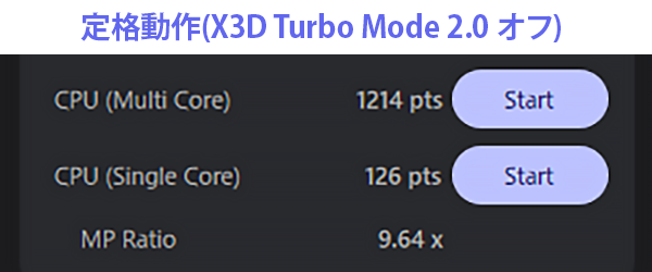 こちらもCyberpunk 2077と傾向は近い印象。X3D Turbo Mode 2.0 エクストリームゲーミングのみ8コア/8スレッド動作になるのでマルチコア性能が下がりますが、X3D Turbo Mode 2.0にすると全体的に少し性能が底上げされる印象です。