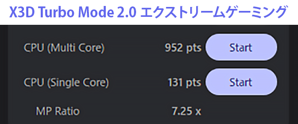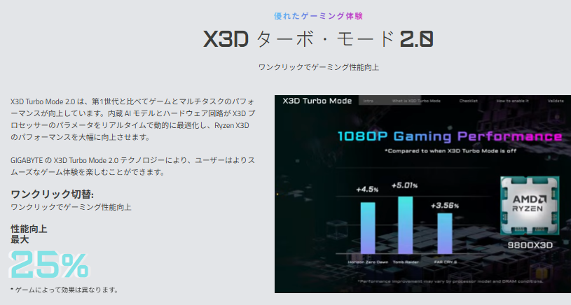 GIGABYTEによると、X3D Turbo Mode 2.0はゲーマーモードとクリエイターモードの異なるモードがあり、用途に合わせ切り替えることで最適なパフォーマンスが実現できると解説があります。性能は最大25%向上するケースもあるとのこと。ただし、ユーティリティの説明に「X3D Turbo Mode 2.0 only works with Ryzen 9950/9900/9800 X3D processors」とあるので、9000シリーズのX3D系CPUのみで利用できる限定された機能のようです。