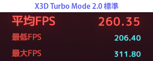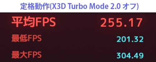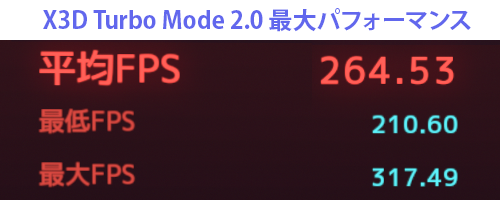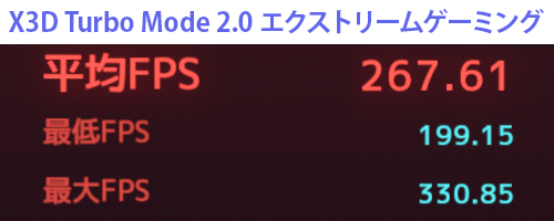 設定ごとの結果は以下の通り。X3D Turbo Mode 2.0を利用すると、平均FPSは最大で約5%ほど、最大FPSは約9%ほど性能が向上しました。X3D Turbo Mode 2.0を有効にするだけで少し性能が上がり、エクストリームゲーミングなどの特化設定を選ぶとさらに向上するといった印象です。