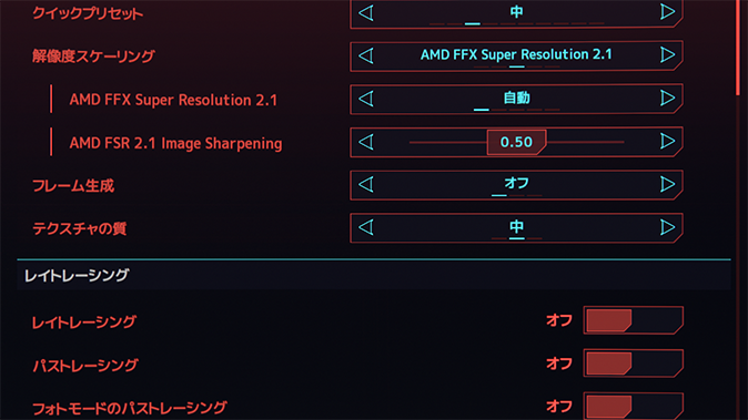 まずはCyberpunk 2077で効果を確認してみました。GPU側が先に性能限界に達してしまうと効果がわからなくなるので、解像度WQHDで画質設定は「中」を選択し、そこそこ軽めの設定で試してみました。
