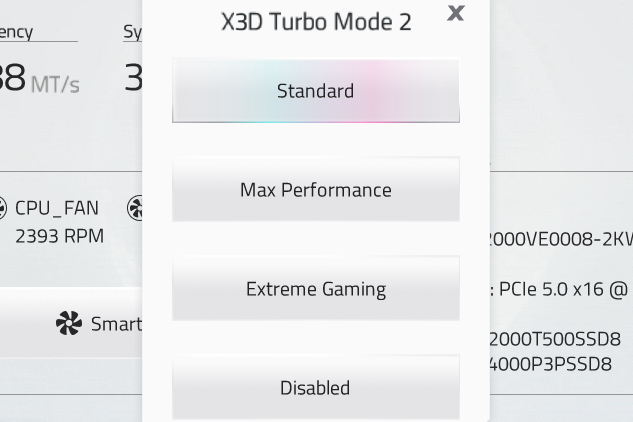 X3D Turbo Mode 2.0の設定は、BIOSの設定項目またはユーティリティを介して行うことが可能。標準(Standard)、最大パフォーマンス(Max Performance)、エクストリームゲーミング(Extreme Gaming)、停用(Disabled)の4つの項目があります。停用(Disabled)を選ぶとX3D Turbo Mode 2.0を利用しない定格動作になり、ほかの3つはX3D Turbo Mode 2.0が有効になります。