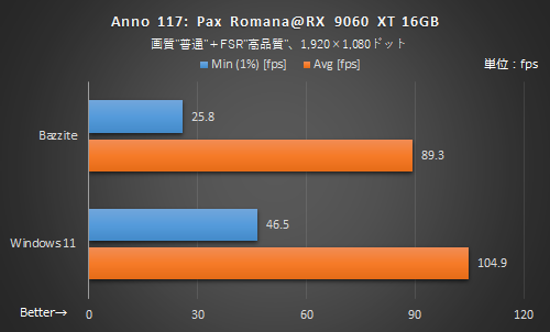 「Anno 117: Pax Romana」では画質「普通」に設定。ゲーム内ベンチマーク再生時におけるフレームレートを計測した。ここでのアップスケーラー設定は「高品質」だが、このゲームの設定の訳がそうなっているだけであり、実際は「クオリティ」設定と考えられる。