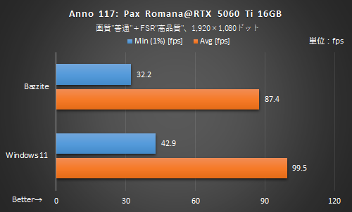 全体的にBazziteの平均フレームレートはWindowsのそれよりも最大15%程度下がる。互換レイヤーを利用して動かしている以上仕方のないところか。最低フレームレートが低いのはAnno 117: Pax Romanaのベンチマークシーンの設計上の問題であるが、今回の検証ではBazzite+RadeonよりもBazzite+GeForceの組み合わせのほうが最低フレームレートが落ち込みにくいようだ。