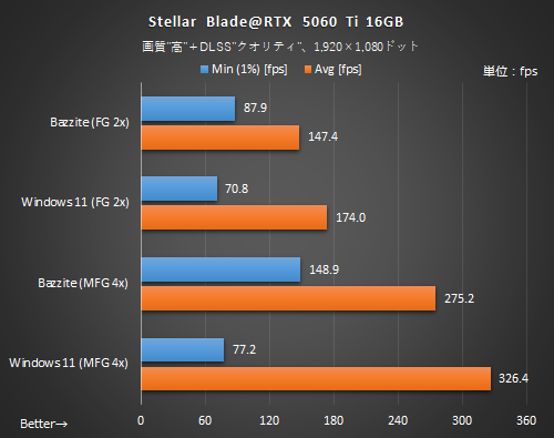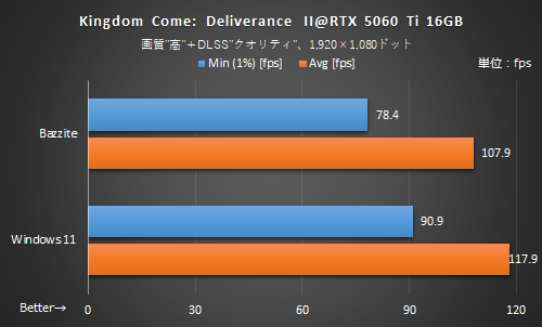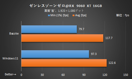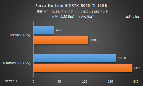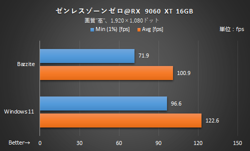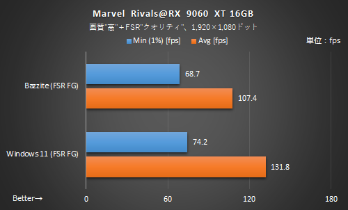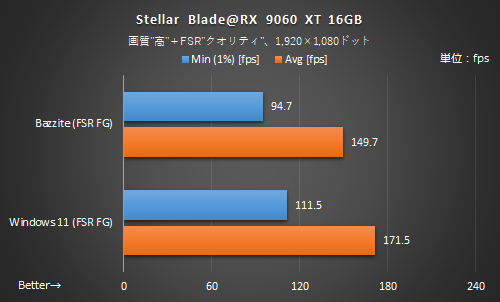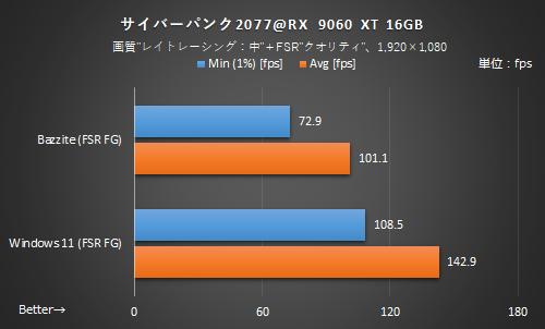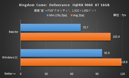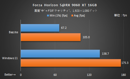まず平均フレームレートの出方に注目すると、やはりここでもWindows 11のほうがBazziteよりもフレームレートが伸ばしやすい。しかし最低フレームレートに注目すると、Bazzite+GeForce環境のほうがWindows+GeForce環境より最低フレームレートが落ち込みにくいという結果が出た。