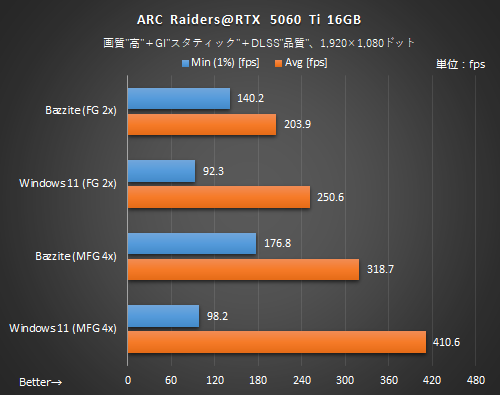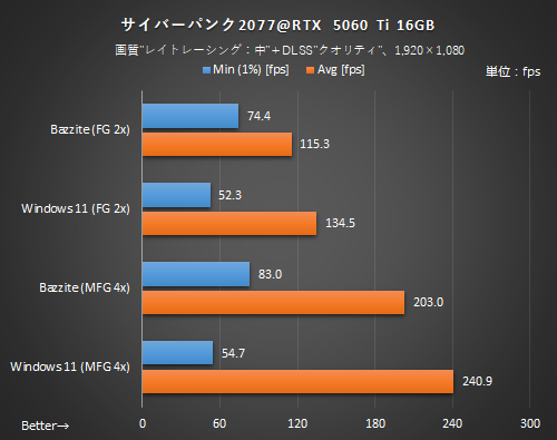 RadeonではWindowsとBazziteのフレームレート格差は小さいが、GeForce環境ではBazziteのパフォーマンスが出にくいようである。ただ、Bazzite+GeForce環境でもフレーム生成(2x)を付けることで平均200fps程度に到達できている点は評価できるだろう。そしてここでも、Windows+GeForce環境よりもBazzite+GeForce環境のほうが最低フレームレートの落ち込みが小さく、スタッターが出にくいことが示されている。