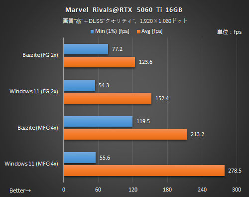 Marvel Rivalsでも平均フレームレートはWindows>Bazziteとなる傾向に変わりはない。ただ最低フレームレートの落ち込みにおいて、Bazzite+GeForce環境はWindows+GeForceに比してアドバンテージがあるように見える。