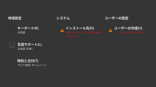 インストール手順は第1回で解説した手順と大筋は変わっていないが、インストール用ISOイメージを取得した場合、Liveイメージ(Live ISO)がダウンロードされるように変更された、という点には触れておくべきだろう。ちなみに従来使われていたインストーラーは「Legacy」と名前を変え、2番目の選択肢として提供される。LiveとLegacyどちらを選んでも機能的に違いはないのだが、慣れていないととまどうかもしれないので今回触れておくべきだと判断した。