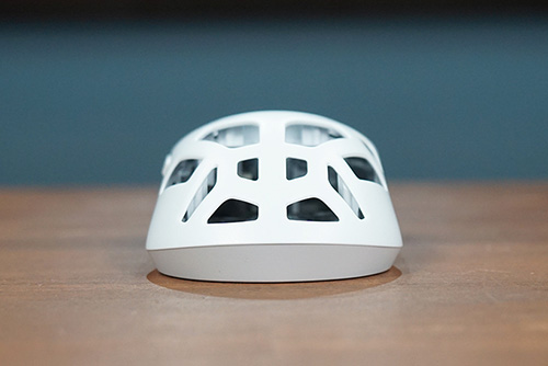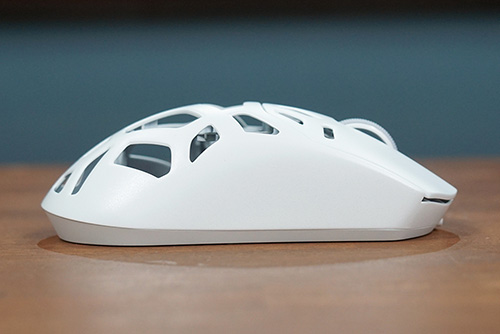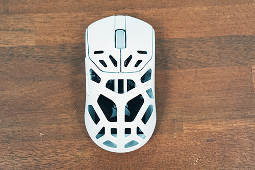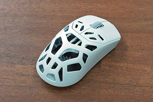 ゲーム使用時にまず思ったのは、肉抜きの違和感の無さ。穴の位置が工夫されているので、握った際の感触や操作感は肉抜きされていない通常のマウスに近い感覚で使用できる。肉抜きされている分熱がこもりにくいので、夏場などに長時間使用しても快適に使用できそうだ。手汗をかきやすい人にも通気性が良いこうしたマウスは好適かもしれない。