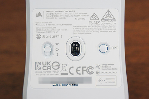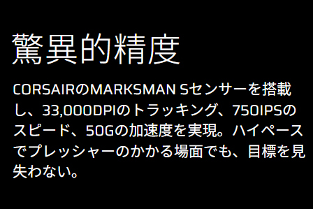 センサーは33,000DPIの光学式センサー「CORSAIR MARKSMAN Sセンサー」が搭載されている。トラッキング性能は最高速度750IPS、加速度は50G対応がうたわれている。