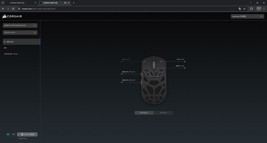 SABRE v2 PRO WIRELESS MGは、「CORSAIR Web Hub」に対応。ドライバソフトウェアのインストール不要で、ブラウザ上から手軽にマウスの機能設定が行える。なお、マウスの設定変更の際には、有線接続または2.4GHz専用レシーバー接続を行う必要があり、Bluetooth接続時は設定が変更できない。
