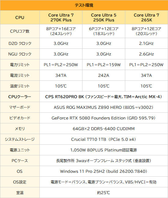 Core Ultra 200S Plusのレビュアーズキットに同梱されていたのはCore Ultra 7 270K PlusおよびCore Ultra 5 250K Plus。比較のために用意したCore Ultra 7 265Kと合わせてベンチマークテストを実行し、新モデルのパフォーマンスを確かめる。