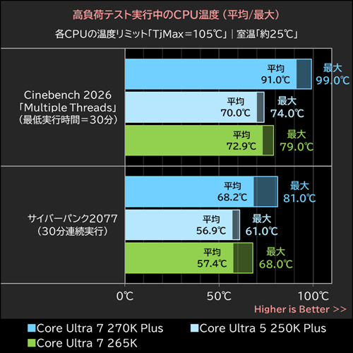 CPUコアがフル稼働するCinebench 2026実行中のCPU温度は、Core Ultra 7 270K Plusが平均91.0℃(最大99℃)、Core Ultra 5 250K Plusは平均70.0℃(最大74℃)、Core Ultra 7 265Kは平均72.9℃(最大79℃)だった。各CPUの温度リミット(TjMax)は105℃なので、いずれもサーマルスロットリングが発生しない温度を維持していた。